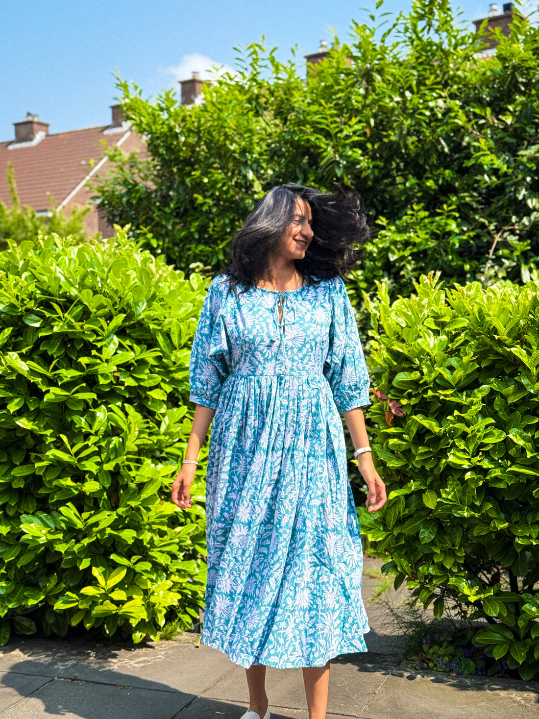 Every dress is hand block printed in India, using age-old traditional techniques passed down through generations of artisans. This means no two pieces are ever exactly the same – tiny variations in print and colour are part of the charm, and a reminder that your dress was made by hand, not by a machine.